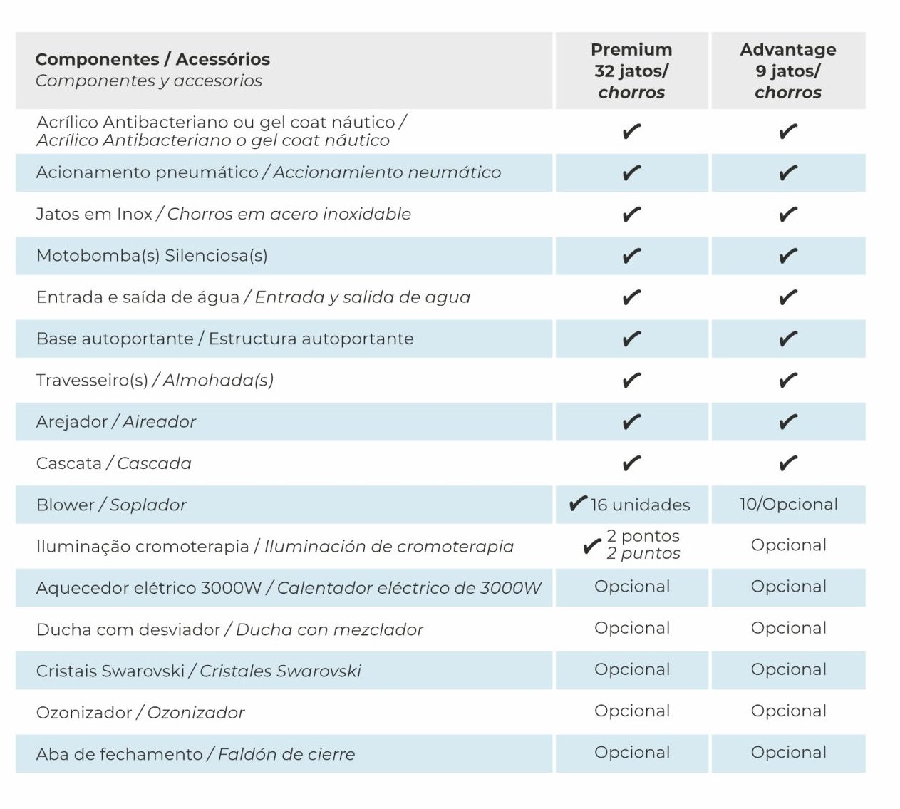 | Modelo | Versão | Material | Comprimento / Diâmetro (cm) | Largura (cm) | Altura (cm) | Volume (L) | Total de jatos | Jatos Dir. | Turbo Jatos | Micro Jatos | Blower | Peso c/ emb. (kg) | Peso s/ emb. (kg) | Potência Motor |